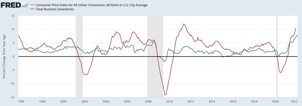 During the beginning of the pandemic, companies were not rebuilding inventories, so as the economy began to reopen and sales increased, companies got caught with fewer items in their warehouses to meet that demand. Today, we still have historically low inventories, and that leaves lots of room for businesses to continue to build. You can see from the chart below that Inventories (red) are a pretty good indicator of consumer prices (blue).